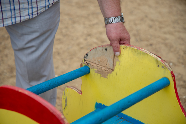На участках детские аттракционы выполнены из фанеры, поэтому после дождя они расслаиваются и становятся травмоопасными.