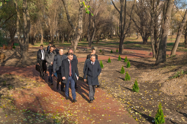 По словам Виктора Тягая, планируется обустройство пешеходных дорожек и двух многоступенчатых входов, установка беседок, скамеек, урн, а также полутора десятка фонарей. Выслушав руководителя района и осмотрев территорию, Вадим Красносельский отметил, что её расположение – идеальное с точки зрения размещения парковой зоны. Благоустраивать надо всю площадь от пляжа до моста, причём подходить к вопросу комплексно, уверен президент. Интересовало главу государства, почему нет проекта будущего парка.