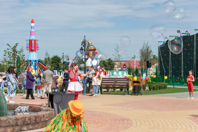 Развлекательные зоны в этот день были организованы по всему Екатерининскому парку. В спортивном секторе проходит физкультурно-игровая программа: выступают акробаты, проводятся эстафеты, состязания и конкурсы. На роллердроме – показательные выступления и мастер-классы. У фонтанного комплекса работают аниматоры, ведущие интерактивных программ, аквагримеры. На сценической площадке – кукольный спектакль «Золотой цыпленок», подготовленный артистами государственного театра драмы и комедии им. Н. С. Аронецкой.