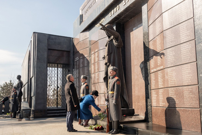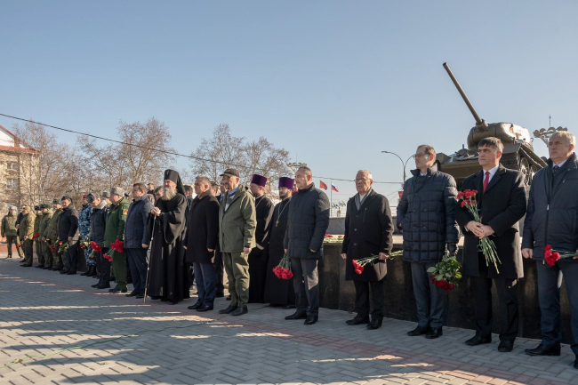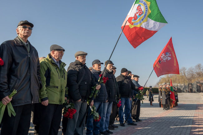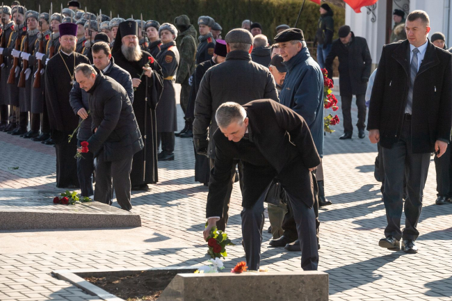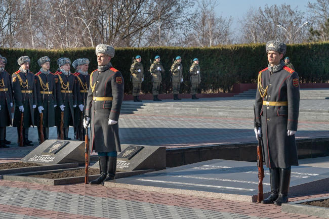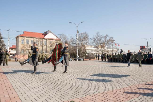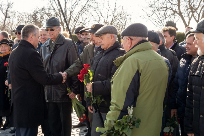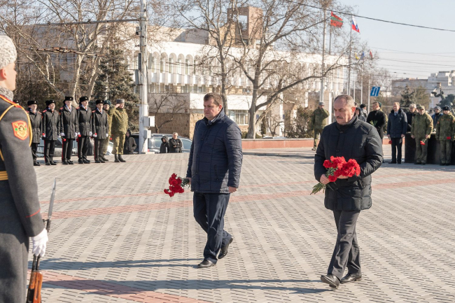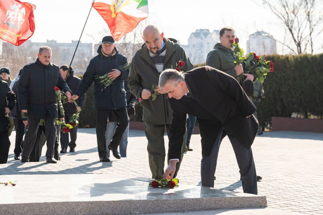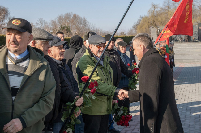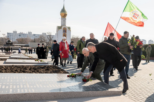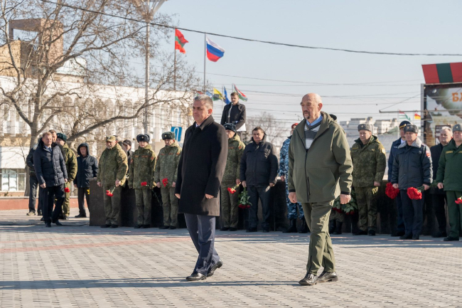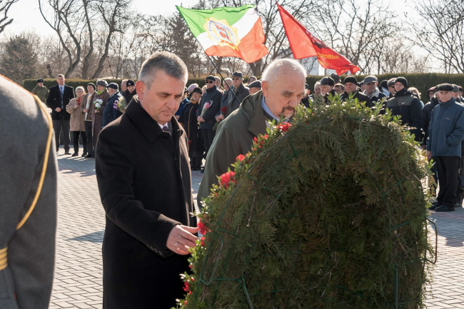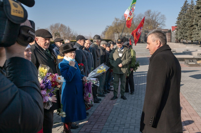 Глава приднестровского государства Вадим Красносельский и первый Президент ПМР Игорь Смирнов возложили венок к Вечному огню. Участники митинга оставили россыпь живых цветов у могил и памятников героям, в разное время отдавшим жизни, защищая приднестровский народ.