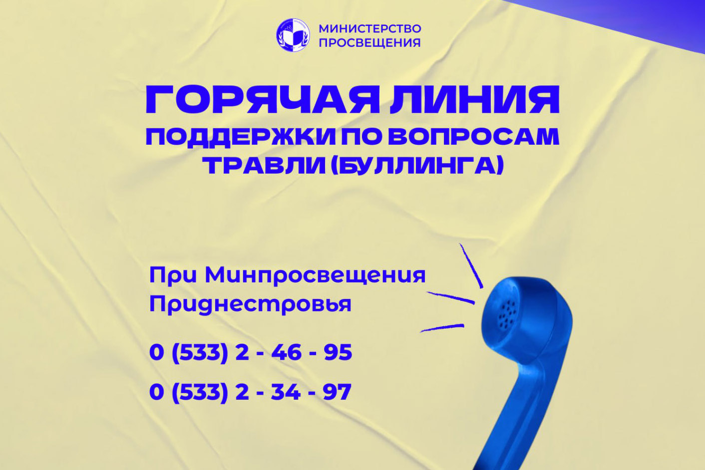 29 Янв., 2026, 14:56Тирасполь, 29 января. /Новости Приднестровья/. При Министерстве просвещения ПМР работает горячая линия по вопросам травли (буллинга) в образовательных учреждениях. Её номера: 0 (533) 2-46-95, 0 (533) 234-97.