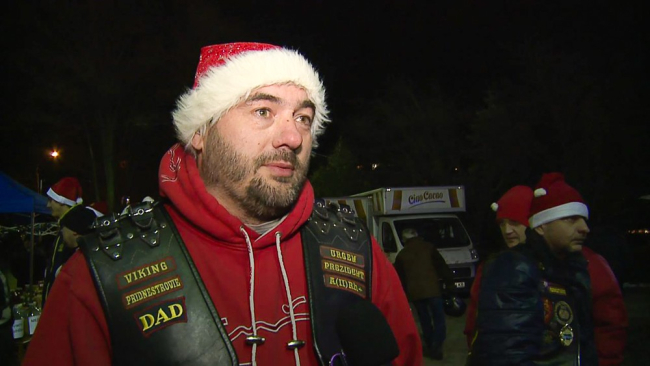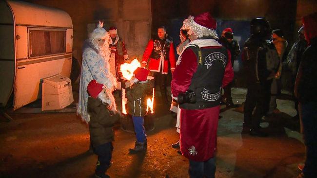 Здесь же у ёлки состоялся ещё один важный обряд — посвящение новичков, которых по давней байкерской традиции отлупили жилетами.