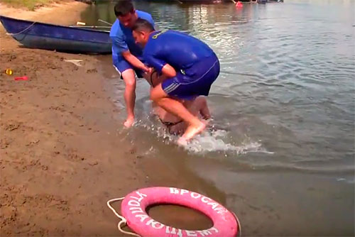 Пресс-служба МВД сообщает, что в тот день на спасательной станции несли службу Вячеслав Обручков и Константин Титянков. Осматривая территорию, в 15 метрах от берега они увидели женщину, которая пыталась удержаться на поверхности воды.