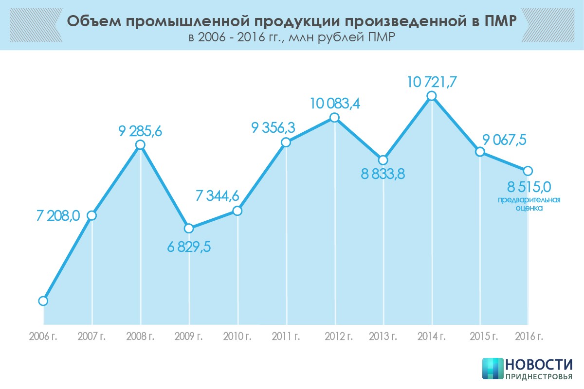 Тирасполь, 13 февраля. /ИА «Новости Приднестровья»/. Объемы промышленного производства Приднестровья сократились в 2016 году на 10,3 % (без учета показателей субъектов малого предпринимательства). В долларовом эквиваленте промроизводство составило 683,5 млн долларов, или 88,5% от показателя 2015 года. Такие данные опубликованы в «Кратких итогах социально-экономического развития ПМР в 2016 году» Минэкономразвития.