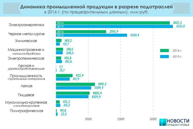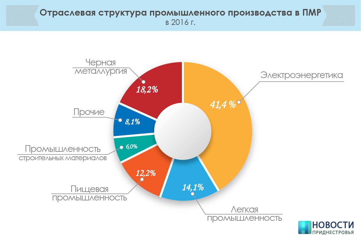 При этом спад был отмечен в электроэнергетическом комплексе (-2,5%) и черной металлургии (-29,4%), на которые приходится больше половины в отраслевой структуре промышленности Приднестровья. Спад в энергетическом секторе обусловлен нестабильным спросом на сгенерированную электроэнергию со стороны ключевых потребителей как на внешнем, так и на внутреннем рынке. В черной металлургии сократилось производство проката черных металлов на 30,2% и стали на 70,3%. Негативное влияние оказала также высокая стоимость сырья. В результате этих факторов крупнейший в регионе металлургический завод ММЗ работал нестабильно.