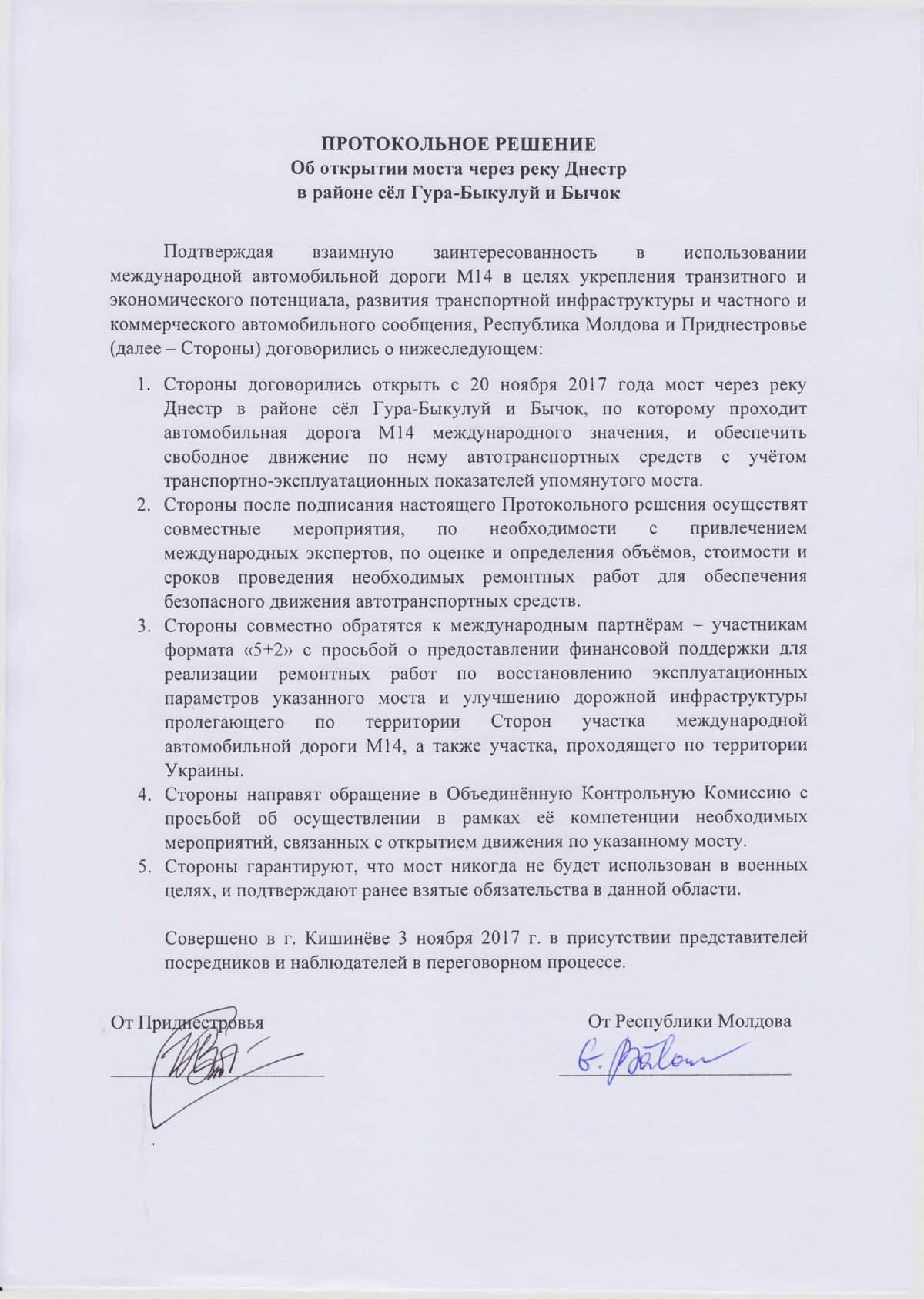 Протокольное решение «Об открытии моста через реку Днестр в районе сёл Гура-Быкулуй и Бычок»