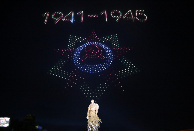 Во время светового шоу беспилотники выстраивались в фигуры, посвящённые Великой Победе