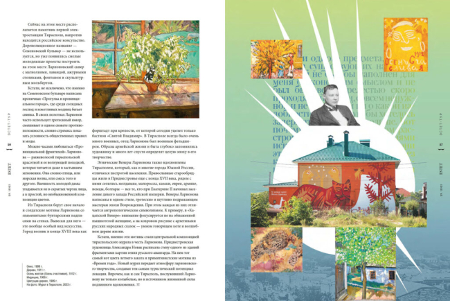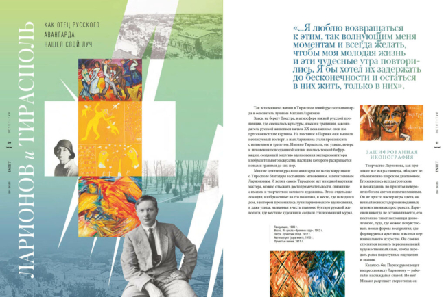 На страницах журнала яркими красками описана атмосфера южной провинции на берегу Днестра, где смешались традиции и культуры разных народов, где родился и провел юность законодатель русской живописи начала 20 века. Именно Тирасполь, его улицы, вечера и мгновения повседневной жизни стали вдохновением для многих работ Михаила Ларионова.