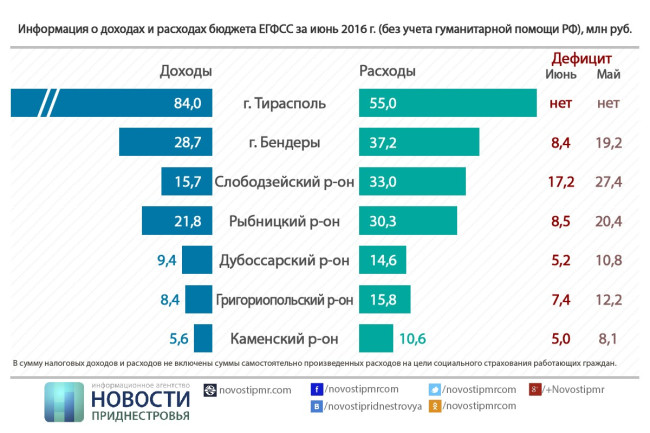 По итогам июня наблюдается значительная разница между доходами и расходами ЕГФСС. Дефицит составляет 11,6%. При этом только по Тирасполю поступившие в бюджет ЕГФСС доходы превалируют над его расходами на выплату пенсий и социальных пособий жителям данной административно-территориальной единицы. Здесь было собрано на 53% больше, чем потрачено. В остальных регионах, наоборот, расходы превалируют над полученными доходами.