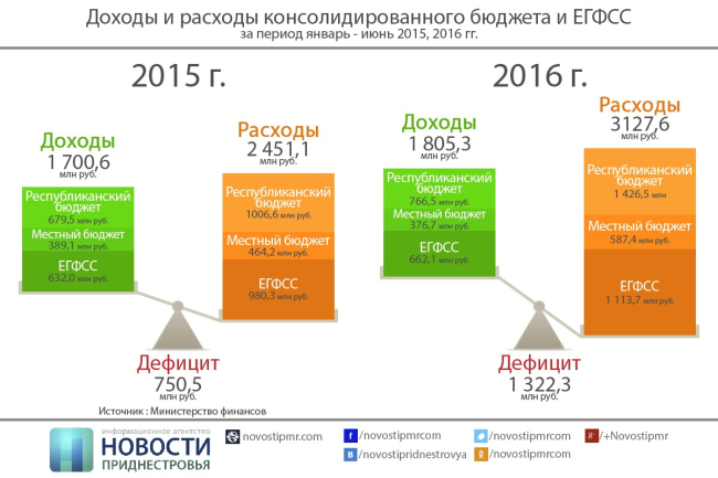 Тирасполь, 21 июля. /ИА «Новости Приднестровья»/. В первом полугодии 2016 года, по сравнению с аналогичным периодом 2015, фактический дефицит консолидированного бюджета вырос практически вдвое. Согласно данным Министерства финансов, по итогам 6-ти месяцев 2015 года разница между поступившими в бюджет доходами и израсходованными средствами составляла 750,5 млн рублей, в первом полугодии 2016 эта цифра равняется уже 1 млрд 322,3 млн рублей.
