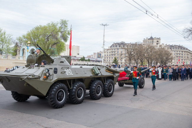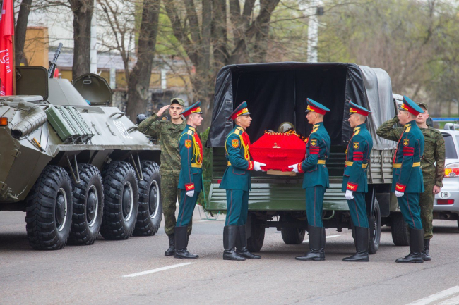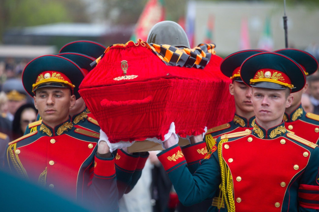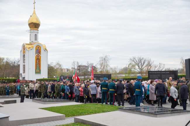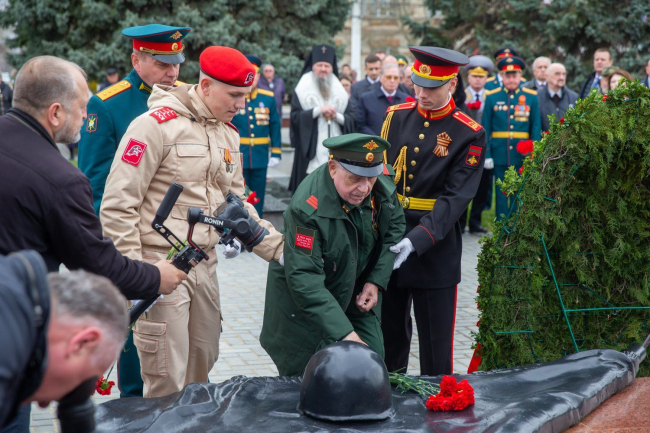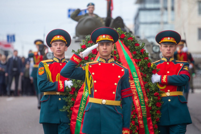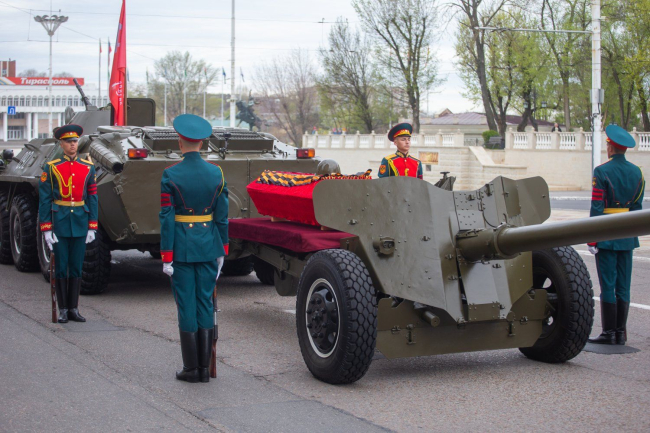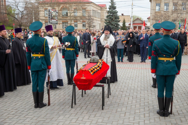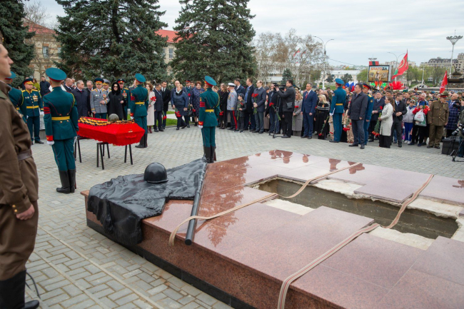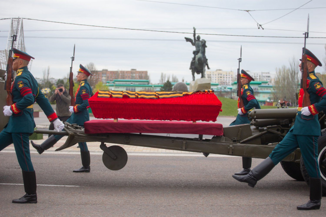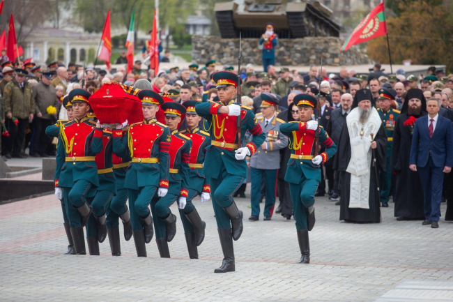 16 Апр., 2025, 11:02Тирасполь, 16 апреля. /Новости Приднестровья/. Сегодня на Мемориале Славы Тирасполя состоялся торжественно-траурный ритуал погребения останков неизвестного солдата. Здесь установлена полуторатонная композиция – это надгробие могилы, в которой нашел сегодня упокоение участник Великой Отечественной войны, предположительно погибший в 1944 году. Его останки обнаружили в марте 2025-го при раскопках в районе села Парканы. Имя солдата осталось неизвестно. И сегодня он прошел свой последний путь с воинскими почестями, которых не был удостоен восемь десятилетий назад: по главной площади столицы, под Знаменем Победы, с почетным эскортом, в сопровождении первых лиц государства, военнослужащих и будущих защитников Отечества, священнослужителей, общественников, тираспольчан и гостей города, прибывших проститься с воином.