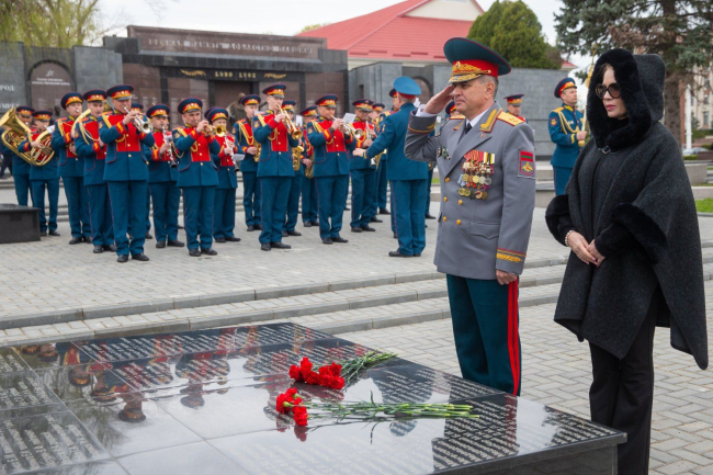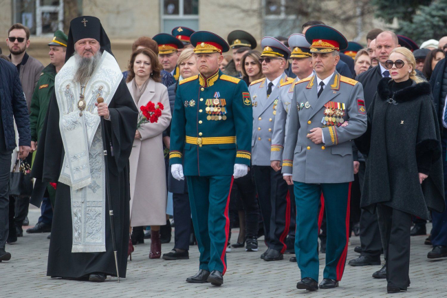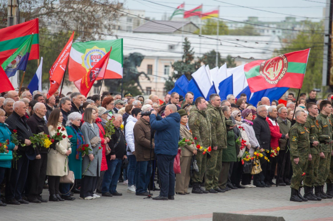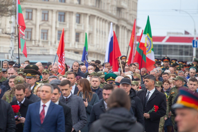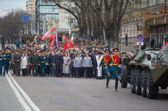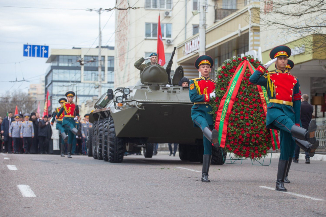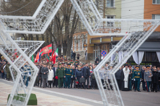 Траурная процессия прошествовала по площади Суворова к мемориальному комплексу, сообщает президентская пресс-служба. У расположенной на Мемориале Славы часовни Георгия Победоносца Архиепископ Тираспольский и Дубоссарский Савва отслужил поминальную литию по погибшим.