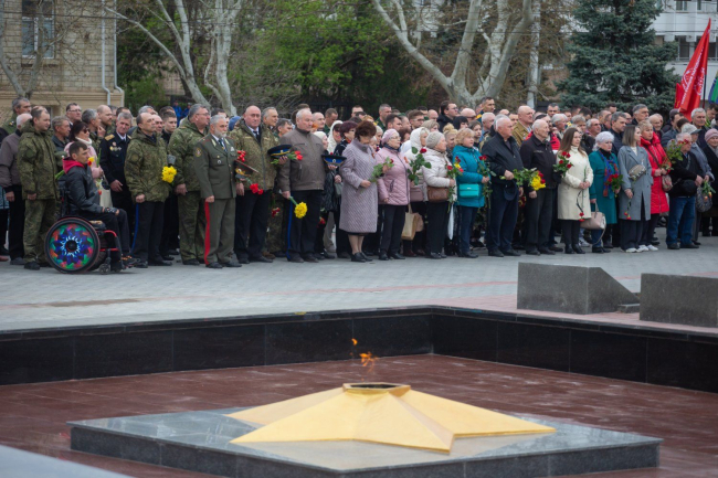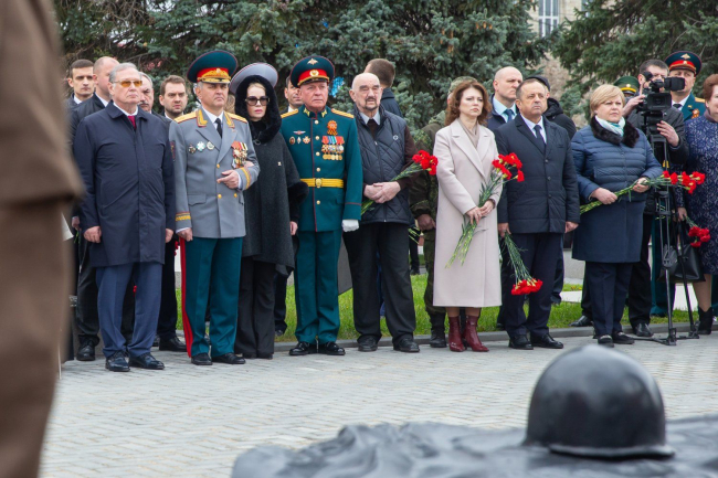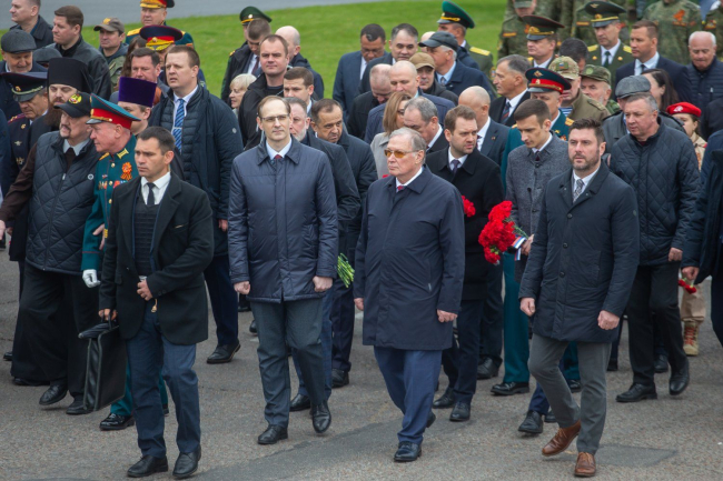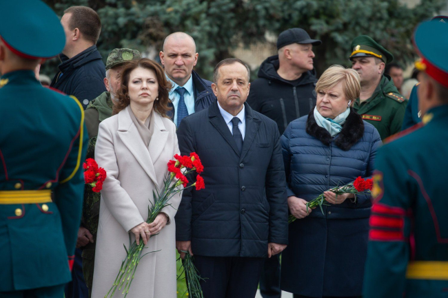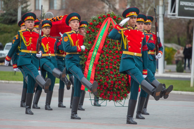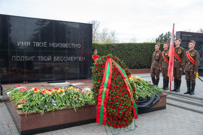 В память обо всех защитниках, павших за свободу и независимость Родины, объявили Минуту молчания. К собравшимся обратился Президент ПМР Вадим Красносельский. Глава государства адресовал слова благодарности ветерану Великой Отечественной войны кавалеру ордена Славы Владимиру Ивановичу Громову, нашедшему в себе силы присутствовать на траурной церемонии. Президент подчеркнул, что испытывает противоречивые чувства: одновременно радости и скорби. Он говорил о том, сколь много безымянных героев еще лежат без упокоения в земле на местах сражений. Руководитель страны от имени приднестровского народа и благодарных потомков возложил венок к могиле Неизвестного солдата.