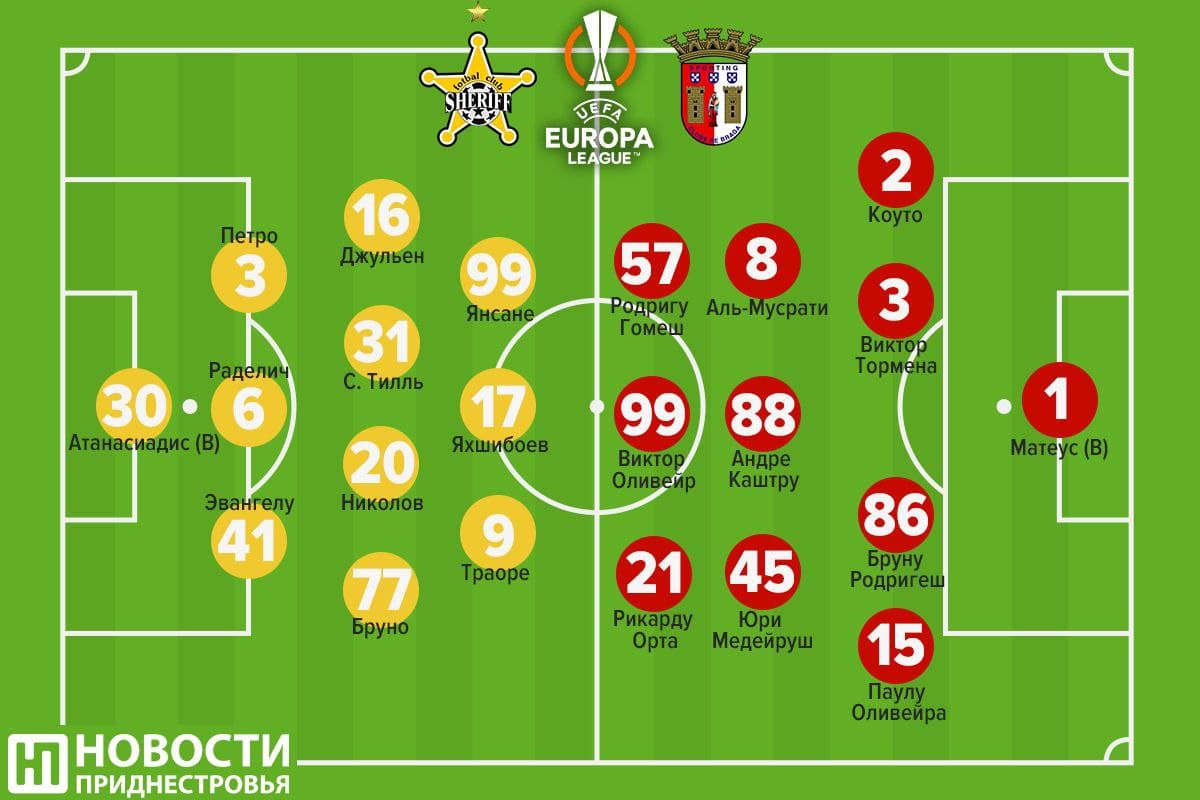 Брага (1-4-3-3): Матеус, Коуто, Витор Тормена, Аль-Мусрати, Паулу Оливейра, Рикарду Орта (к), Юри Медейруш, Родригу Гомеш, Бруну Родригеш, Андре Каштру, Витор Оливейр.
