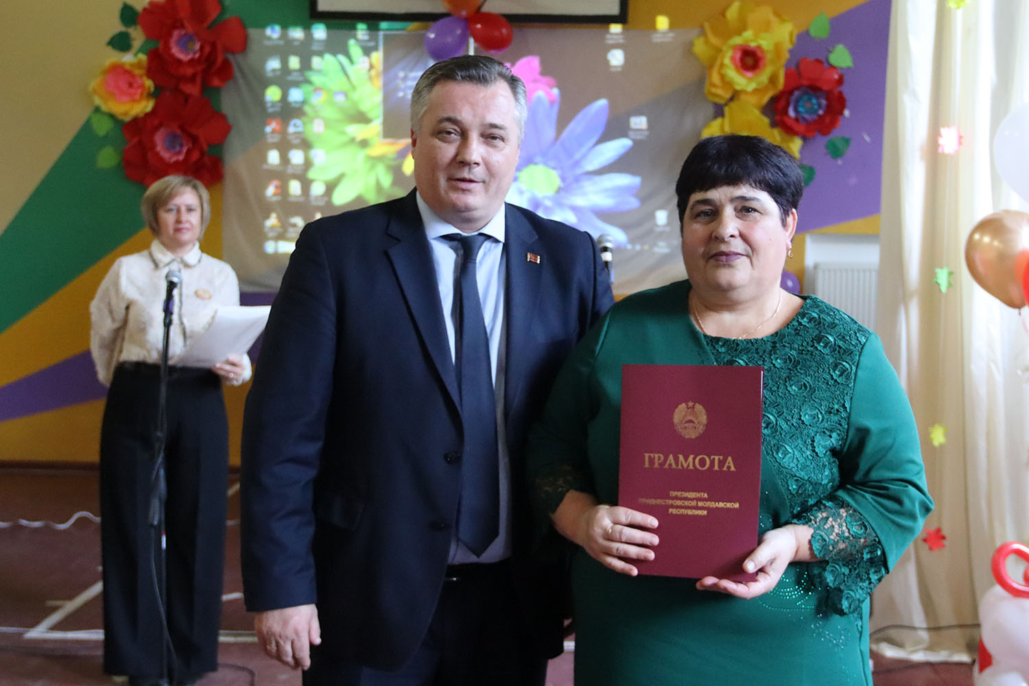Он вручил государственные награды сотрудникам школы. За многолетний труд, успехи и профессионализм, творческие достижения в области обучения и воспитания подрастающего поколения грамотой Президента ПМР были награждены: Лилия Болгарь, Галина Деордюк, Татьяна Окишор.