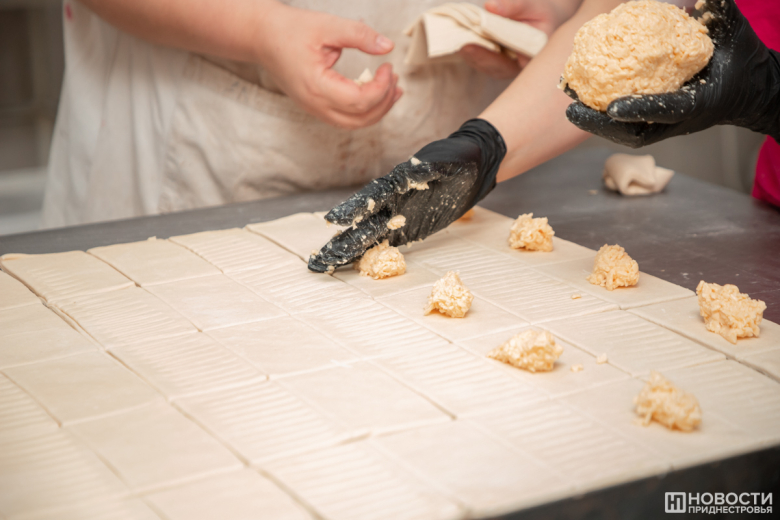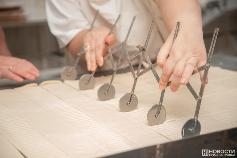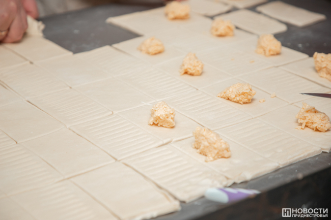В момент прихода гостей там как раз создавали штрудели с сыром. Один рабочий разрезал тесто на кусочки нужного размера, другой накладывал начинку, третий скреплял и перекладывал на противень, для того чтобы тесто расстоялось. Пока машины для слоек и круассанов простаивали (сделанная там продукция как раз допекалась в печи или остывала после неё), работницы заполняли кремом воздушные эклеры.