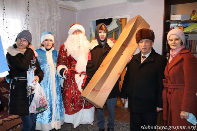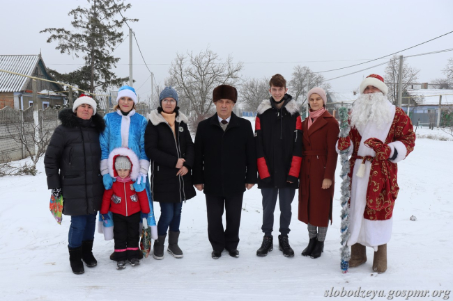 Глава слободзейской госадминистрации Василий Тищенко, председатель Фрунзенского сельского совета Марина Колисниченко, Дед Мороз и Снегурочка поздравили Даниила Ярового. От имени Президента ПМР Вадима Красносельского они вручили мальчику искусственную ёлку, украшения для неё и сладкий подарок.