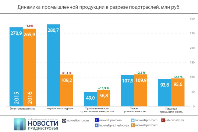 Положительная динамика отмечена и в промышленности строительных материалов. Несмотря на конкуренцию с более дешевыми импортными товарами, зафиксирован прирост в целом по отрасли на 24,5% до 216,3 млн руб., чему способствовала модернизация на Рыбницком цементном комбинате (РЦК), результатом чего стало снижение себестоимости продукции и увеличение объема производства на 36,9%, что обеспечило 84,1% общего выпуска в отрасли.