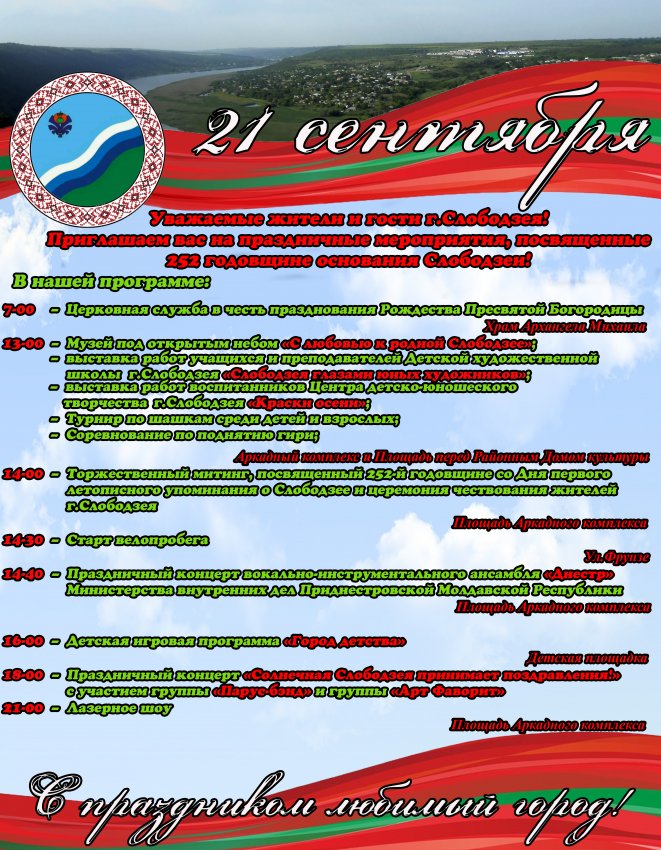 Слободзея, 20 сентября. /Новости Приднестровья/. 21 сентября Слободзея отметит 252-ю годовщину со дня первого летописного упоминания о городе. Праздничные мероприятия начнутся с богослужения в честь празднования Рождества Пресвятой Богородицы в Храме Архангела Михаила.