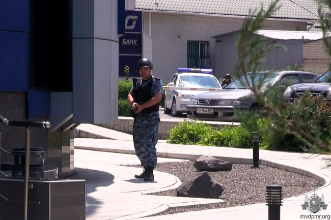 Рыбница, 1 июля. /Новости Приднестровья/. Оперативно-тактические учения Управления вневедомственной охраны Министерства внутренних дел ПМР прошли в Рыбнице. Днём на пульт централизованной охраны Рыбницы поступил сигнал «Тревога!». Экипированный дежурный отряд в течение минуты прибыл к месту происшествия – центральному офису одного из банков в городе. Согласно легенде, неизвестные в чёрных масках ворвались в учреждение. Угрожая оружием, потребовали от кассиров выдачи денежных средств.