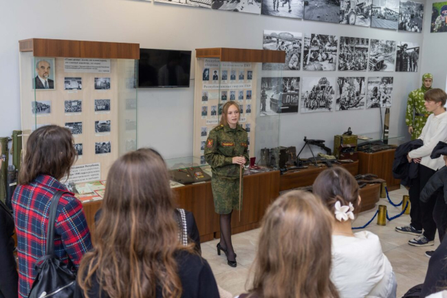 Будущие специалисты и старшеклассники, чьи учебные заведения находятся под шефством военного института Министерства обороны, ознакомились с уникальными экспонатами музея: фотографиями, историческими документами, личными вещами и оружием гвардейцев и бойцов Народного ополчения.