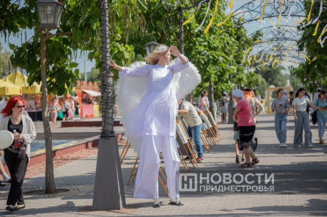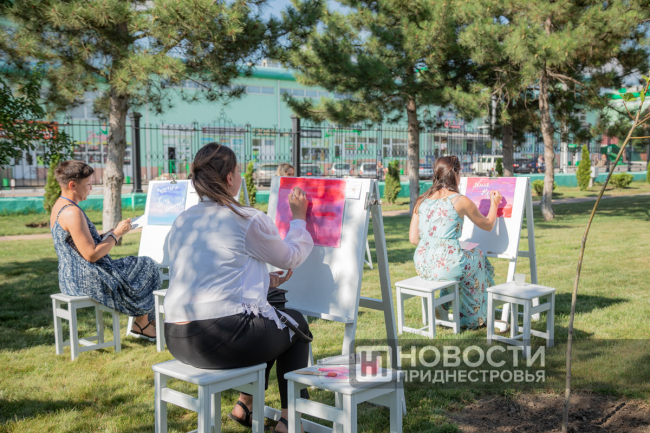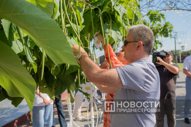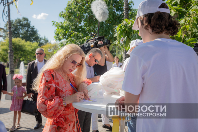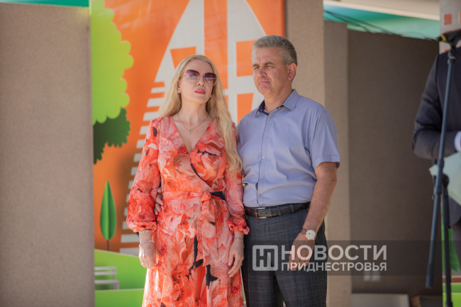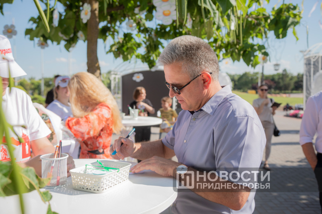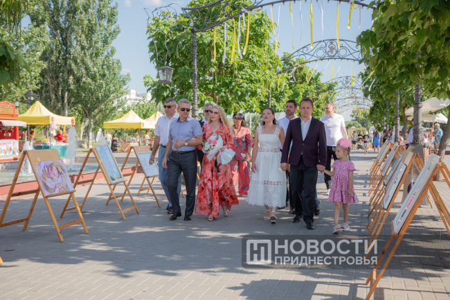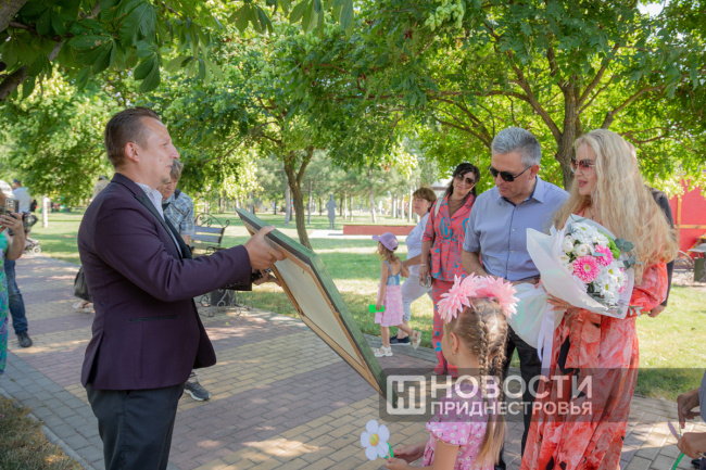 Тирасполь, 5 июля. /Новости Приднестровья/. Ко Дню семьи, любви и верности в Екатерининском парке столицы прошел семейный фестиваль «Семья - волшебный символ жизни!». В торжественном мероприятии приняли участие супруги Красносельские. На аллее фонтанов Вадима Николаевича и Светлану Сергеевну встретила приднестровская семья Коробкиных. Глава семейства Денис представил почетным гостям свою жену Светлану и двоих детей - сына Максима и дочь Нику. Вместе они отправились к выставке творчества приднестровских мастеров. На одном из холстов Светлана Красносельская написала важные слова о том, что семья начинается со счастливого детства, где есть бабушка и дедушка, мама и папа.