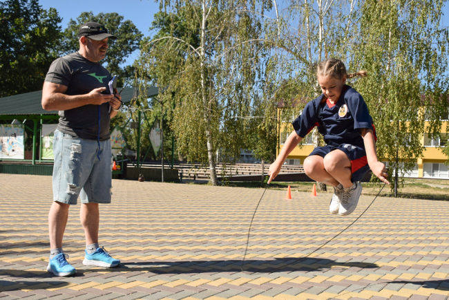 В первый день папы состязались в прыжках в длину с места, в толчке 16-килограммовой гири на количество раз за минуту, мамы – в прыжках со скакалкой и в упражнениях на пресс (также с учетом времени), сыновья – в метании дротиков, в прыжках в длину с места, девочки прыгали со скакалкой (на количество раз за 30 секунд), а также в длину. Умение действовать коллективно семьи проявили в испытании по челночному бегу. День завершился конкурсом художественной самодеятельности.