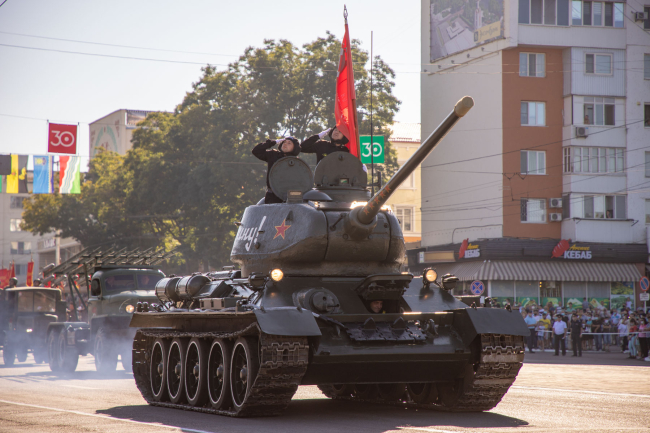 Тирасполь, 2 сентября. /Новости Приднестровья/. Парад в честь 30-летия ПМР и 75-й годовщины Великой Победы на площади Суворова открыла колонна военной техники времен Великой Отечественной войны. Ее возглавил легендарный Т-34-85, который был признан лучшим танком Второй мировой войны и оказал влияние на развитие мирового танкостроения. На его броне – точная копия Знамени Победы.
