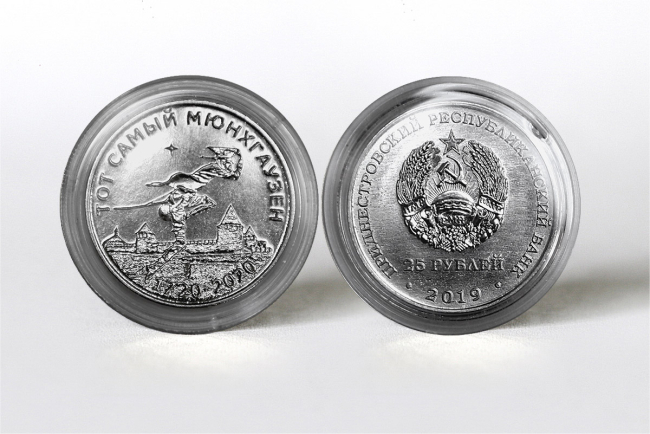 Тирасполь, 10 декабря. /Новости Приднестровья/. Приднестровский республиканский банк ввёл в обращение памятные монеты «300 лет барону Мюнхгаузену». Они выполнены из стали с никелевым покрытием. Номинал каждой – 25 рублей ПМР.