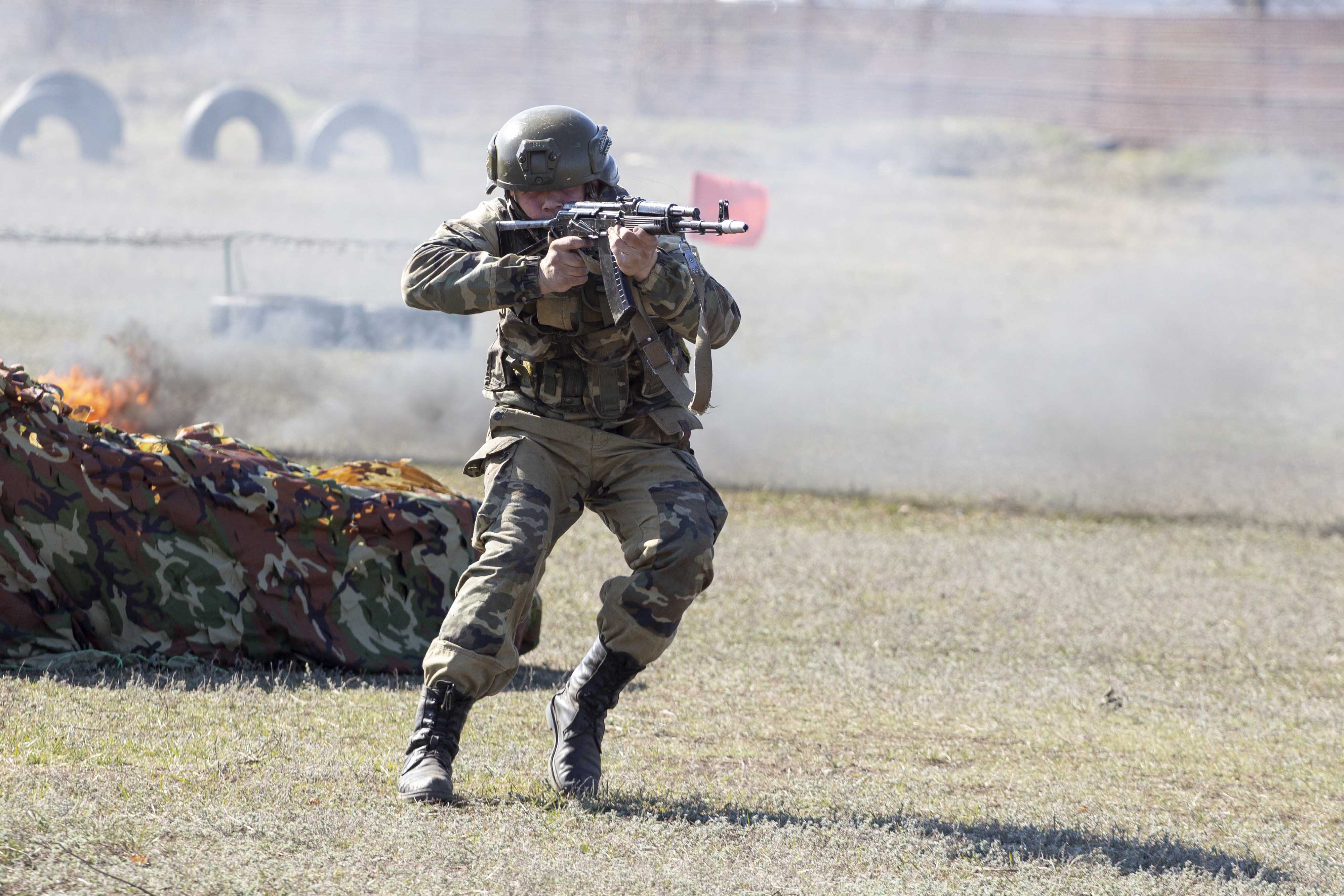Военнослужащие выполнили нормативы по передвижению на поле боя с доставкой боеприпасов и преодолели единую общевойсковую полосу препятствий в усложненном варианте – в условиях задымленности и с применением стрелкового оружия.