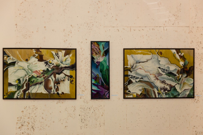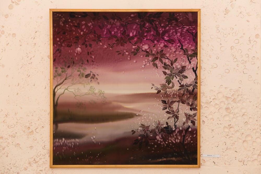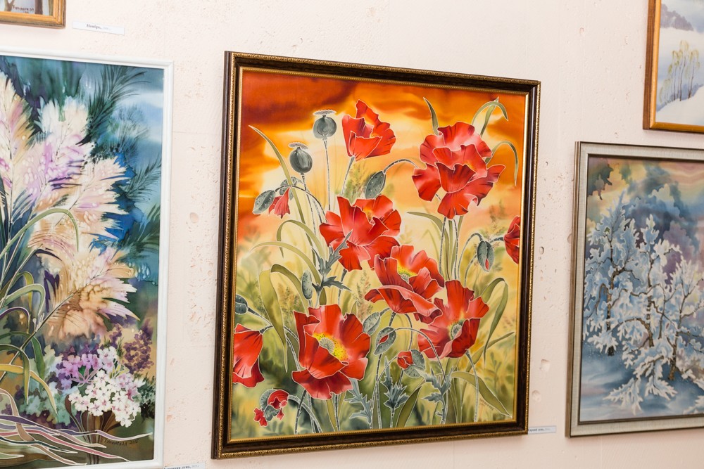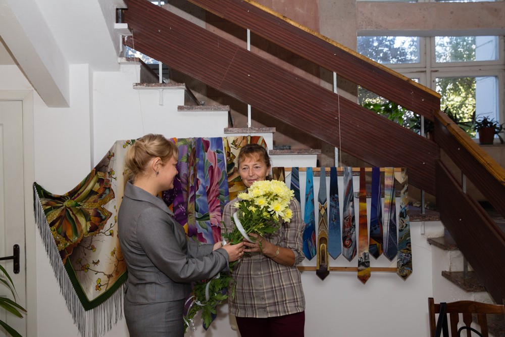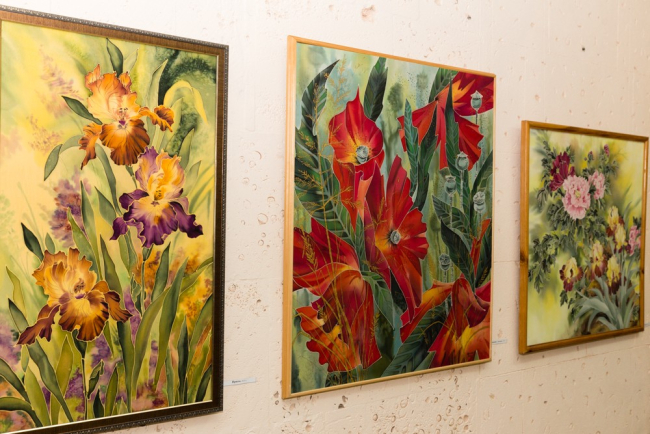 Хоть работы Маргариты Хилинской здесь видят не впервые (художница уже представляла их в рамках одной из выставок), сочные летние краски на натуральном шёлке покорили сердца работников, а главное работниц учреждения.