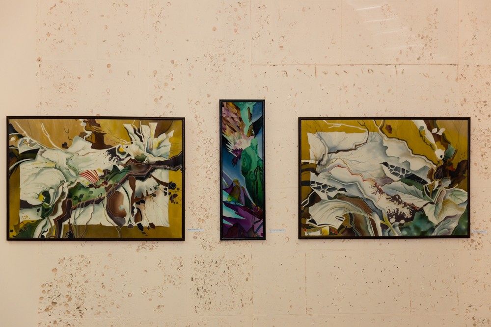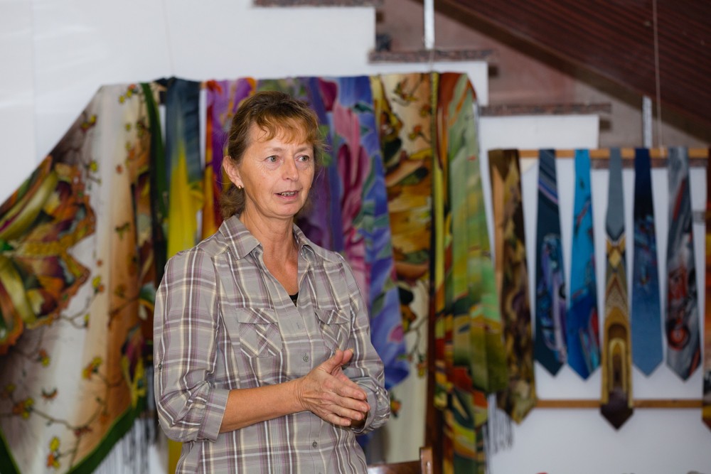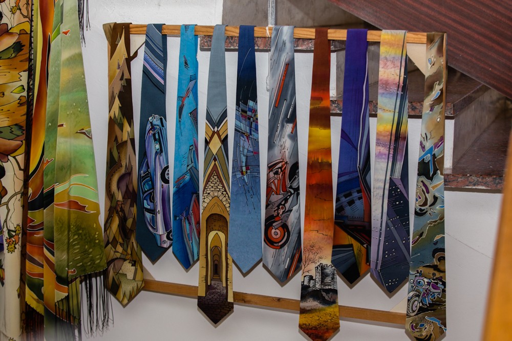«Хотела показать в этой маленькой экспозиции всё, что я могу и умею — абстракцию, пейзажи, цветы. Ещё взяла с собой мужские галстуки и женские платки и шарфики, тоже очень разнообразные, ведь в коллективе много женщин и все они разные, с разными характерами и вкусами», — рассказала она.