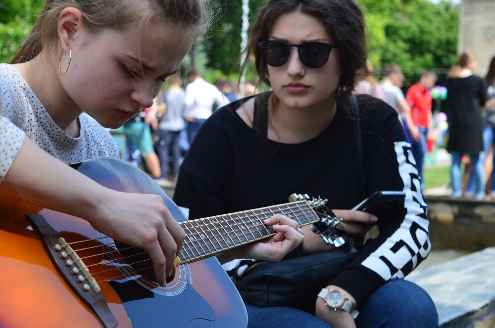 Тем временем, молодежь постарше играет у фонтана на гитаре.