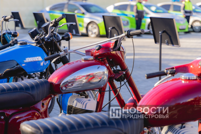 На просторной обновленной территории ГАИ Президенту показали выставку отреставрированных советских мотоциклов.