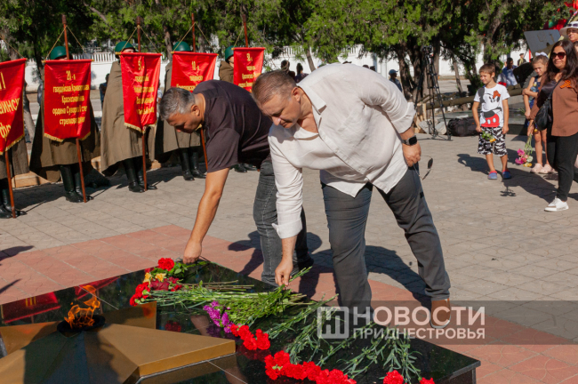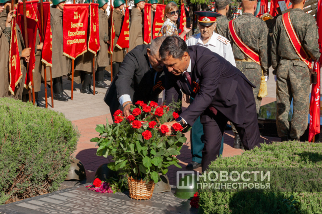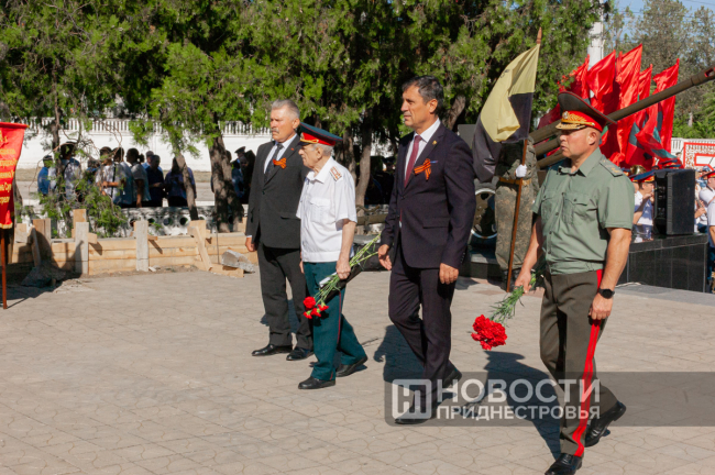 Отдавая воинские почести павшим при освобождении города, мимо Мемориала Славы прошли торжественным маршем суворовцы, подразделения Миротворческих сил, МВД ПМР и Черноморского казачьего войска.