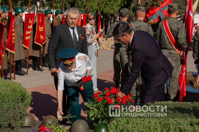 Завершилась церемония минутой молчания и возложением цветов. Первыми цветы возложили глава города Роман Иванченко, председатель горсовета Юрий Кара, председатель ветеранской организации Юрий Ильяшенко и министр обороны ПМР Олег Обручков, депутаты Верховного и городского советов, сотрудники силовых структур и горожане.