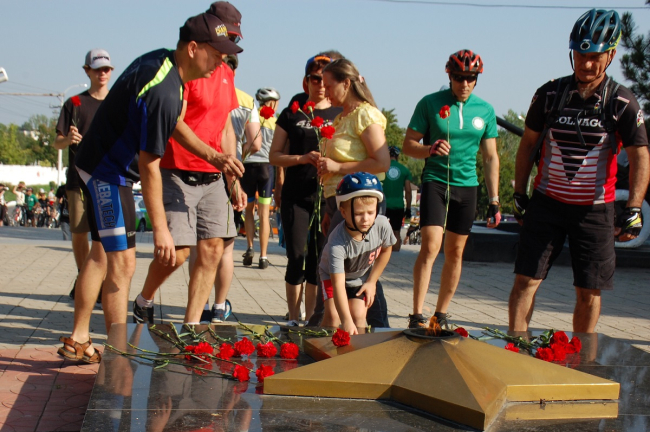 Ровно в девять часов колонна велосипедистов начала движение по улице Суворова в сторону площади Героев. Там, у братских могил воинов Красной армии, павших при освобождении города, состоялась церемония возложения цветов.