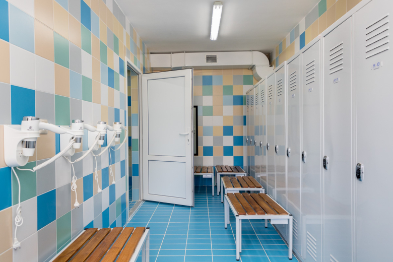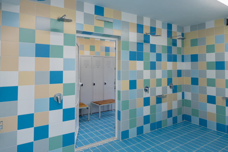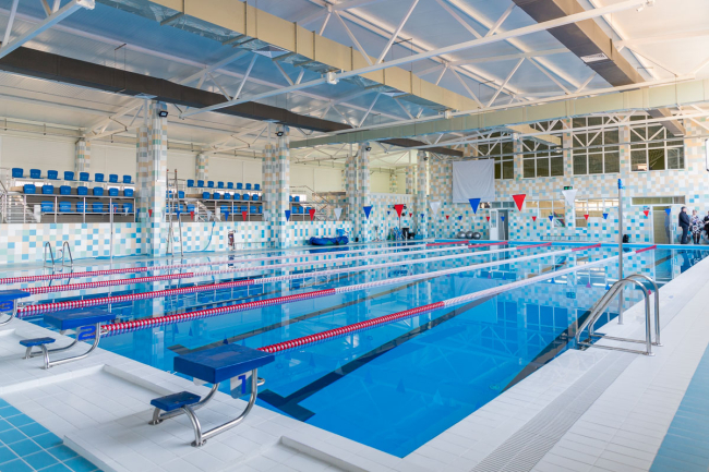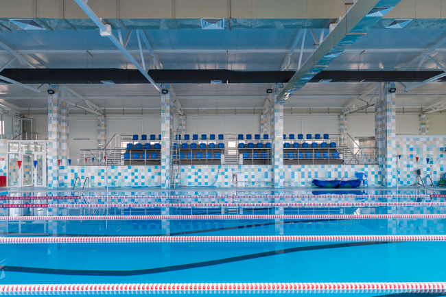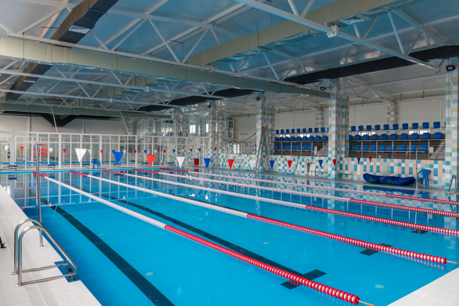Говоря о параметрах бассейна, он отметил, что объём большой чаши – 840 тонн, её длина – 25 м, а самая большая глубина – чуть больше трёх метров. Там размещается шесть водных дорожек. Глубина малого бассейна может варьироваться от 60 до 90 см. Для этого предусмотрен специальный резервуар под чашей для слива воды. Объём составляет 96 тонн. Детский бассейн одновременно может вмещать 19 человек, взрослый – до 50.