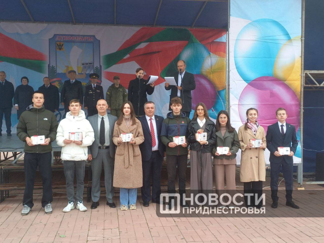 Дубоссары, 26 октября. /Новости Приднестровья/. В Дубоссарах на площади Победы прошла официальная часть празднования Дня города. Руководство города и района вручило госнаграды дубоссарцам и паспорта юным приднестровцам.
