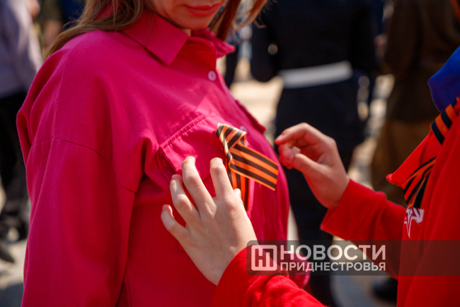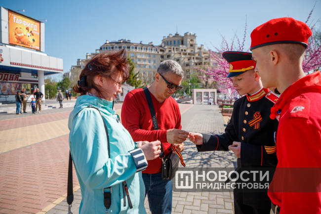 Тирасполь, 13 апреля. /Новости Приднестровья/. В Тирасполе накануне, в день 80-летия освобождения города от немецко-фашистских захватчиков, раздавали георгиевские ленточки - символ победы над фашизмом.