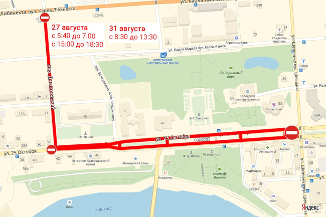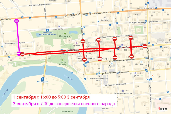 1 сентября с 16:00 до 5:00 3 сентября движение перекроют по ул. 25 Октября: от ул. Ленина (проездная) до пер. Днестровский (проездной) и улицам, пересекающим ул. 25 Октября: по ул. Шевченко: от ул. Свердлова до ул. Р. Люксембург; ул. Луначарского: от ул. Свердлова до ул. Р. Люксембург; по ул. Котовского: от ул. Свердлова до ул. Р. Люксембург; по ул. Манойлова: от ул. Свердлова до ул. Р. Люксембург.