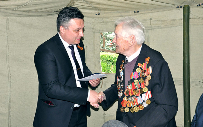 Глава госадминистрации Руслан Чабан поздравил ветеранов с Днем Победы и вручил тем, кто по разным причинам был за пределами города и района в предпраздничные дни, поздравительные открытки и ценные подарки.