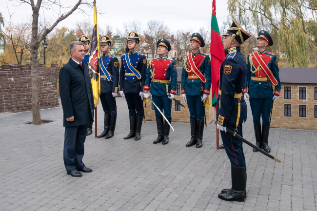 Как сообщает президентская пресс-служба, за происходящим наблюдали курсанты Тираспольского юридического института и Военного института Минобороны. В церемонии были задействованы юные потомки русских воинов – приднестровские суворовцы и кадеты, а также военнослужащие роты Почетного караула.