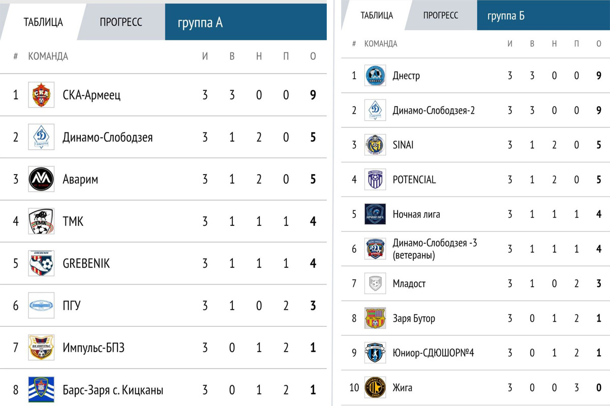 «Динамо-Слободзея - 2» (группа Б) – ещё один коллектив без осечек. В динамовском дерби команда уверенно обыграла «Динамо-Слободзея - 3» (ветераны) – 3:0, подтвердив статус одного из главных претендентов на высокие места.