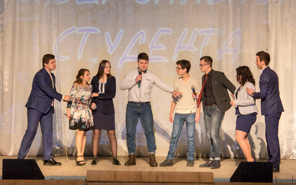 После поздравлений началась концертная программа. На сцене выступили студентки экономического факультета, продемонстрировавшие дефиле, затем их сменила команда КВН «Гагарин».