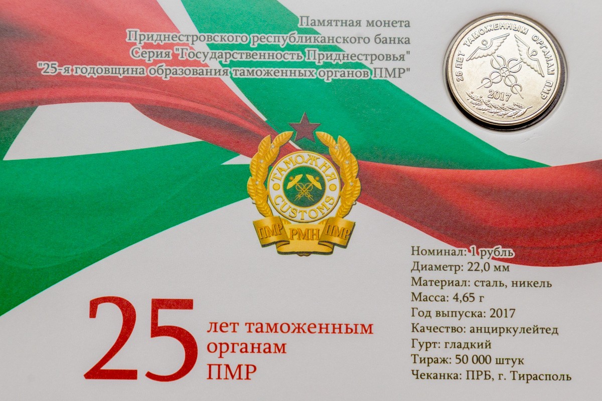 Тирасполь, 28 сентября. /Новости Приднестровья/. В Государственном таможенном комитете презентовали памятную монету и буклет, посвящённые 25-летию ведомства. Для таможенников это не первый опыт подобного взаимодействия с Приднестровским республиканским банком. Первый случился 5 лет назад, когда в честь 20-летия ведомства выпустили серебряную монету, несколько экземпляров которой 1-й зампред ПРБ Алексей Мельник принёс и на эту презентацию.