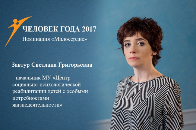 Тирасполь, 16 февраля. /Новости Приднестровья/. Сейчас в большом зале Дворца Республики продолжается награждение победителей государственного художественно-публицистического конкурса «Человек года – 2017». В самой доброй и человечной номинации «Милосердие» победила Светлана Завтур, которая является директором МУ «Центр социально-психологической реабилитации детей с особыми потребностями жизнедеятельности» г. Дубоссары.