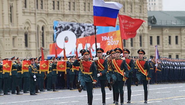 Знаменные группы Преображенского полка выносят на Красную площадь государственный флаг РФ и знамя победы в Великой Отечественной войне. После этого министр обороны России Сергей Шойгу поприветствует военнослужащих, собравшихся на площади. Затем президент России Владимир Путин произнесет торжественную речь, прозвучит гимн РФ и начнется торжественное шествие войск.