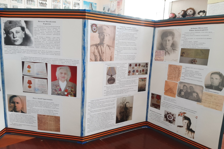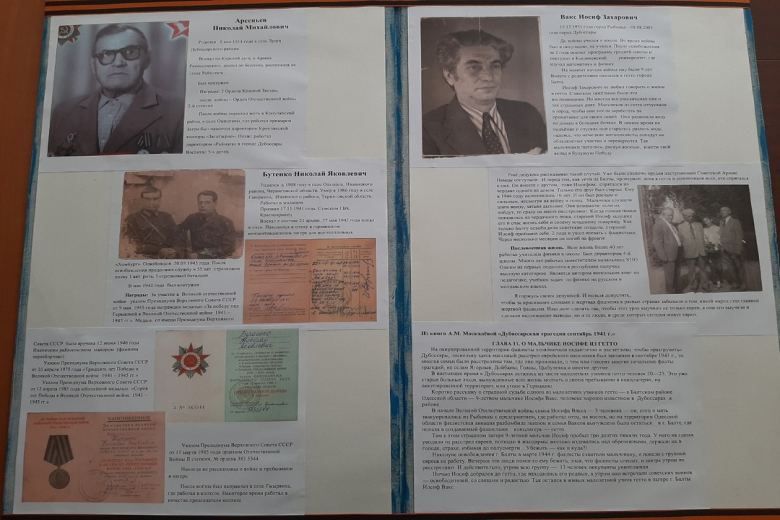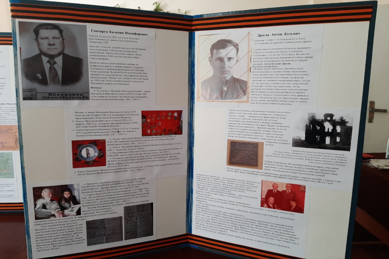Ещё в одной экспозиции воспитанники и руководители кружков собрали интересные фотоматериалы о защитниках Родины. Выставка состоит из 20 портретов и историй о дубоссарских ветеранах Великой Отечественной войны. Фотографиями родственников, их наградами и фронтовыми дорогами поделились педагоги и воспитанники ДДЮТ.