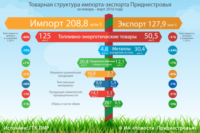 Тирасполь, 19 апреля. /ИА «Новости Приднестровья»/. За первые 3 месяца текущего года, по сравнению с первым кварталом 2015-го, внешний товарооборот республики снизился более чем на 25% – с 451,6 млн долларов до $ 336,7 млн. По данным таможенной службы, снижение по импорту составило более $113 млн (-35%), экспорт приднестровских товаров сократился незначительно (примерно на 1,5%). При этом в структуре внешней торговли импорт по-прежнему опережает экспорт.